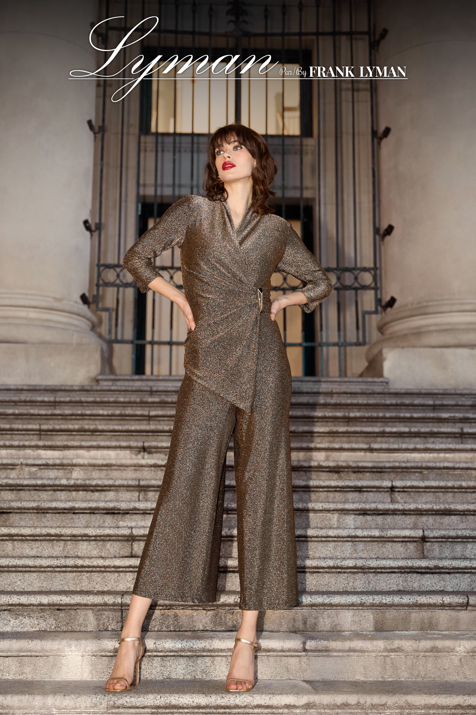 The Frank Lyman Jumpsuit 259297 features elegant 3/4 length pants crafted from a luxurious blend of 78% nylon, 20% metallic fibers, and 2% elastane. This composition ensures a refined sheen, a comfortable stretch, and effortless shape retention, making it perfect for sophisticated occasions where style meets ease.