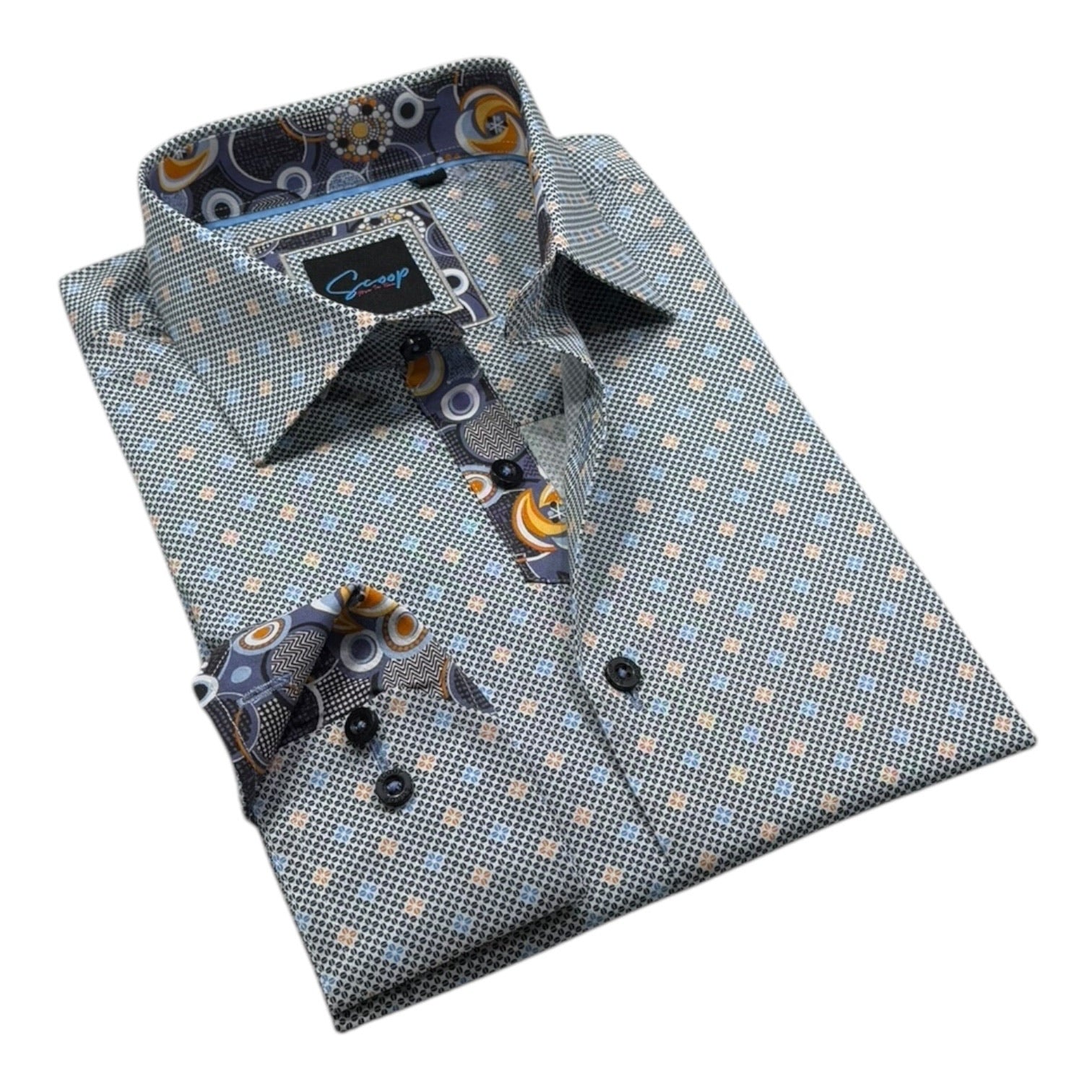 This shirt is where sophistication meets bold personality! With its intricate micro-pattern as the base, it sets the stage for a show-stopping contrast trim inside the collar, cuffs, and placket, featuring lively and unexpected pops of color and design. The button detailing ties the whole look together, adding just the right amount of attitude without overpowering the elegance. Perfect for the guy who wants to make a statement without saying a word, this shirt transitions effortlessly from boardroom confidence to cocktail-hour charm. One glance and you’ll know—it’s not just a shirt, it’s a mood.