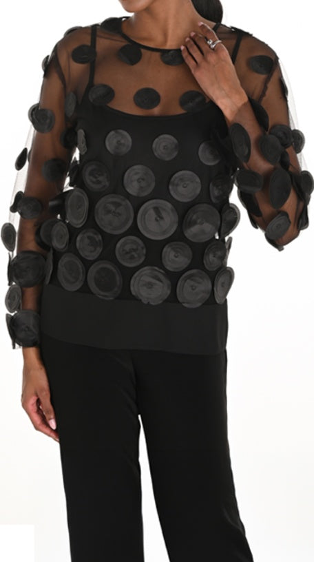 The Frank Lyman Top 259708 features daring transparency crafted from 100% polyester, offering a sleek, bold style that commands attention. Perfect for those who want to make a confident fashion statement with a modern twist.