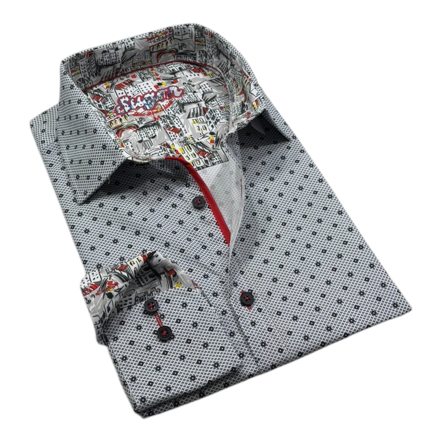 This shirt is a love letter to the stylish wanderer with a playful heart. At first glance, it’s a crisp micro-diamond print in classy black and white, but take a closer look and you’ll find the party hiding on the inside—an inner collar and cuff lining bursting with a colorful cityscape sketch, straight out of a comic book daydream. Bold red stitching along the placket and buttons adds just the right pop of attitude, like a wink in the middle of a serious conversation. Whether you’re strolling into a meeting or a martini lounge, this shirt says, “I’ve got taste… and a sense of humor.”