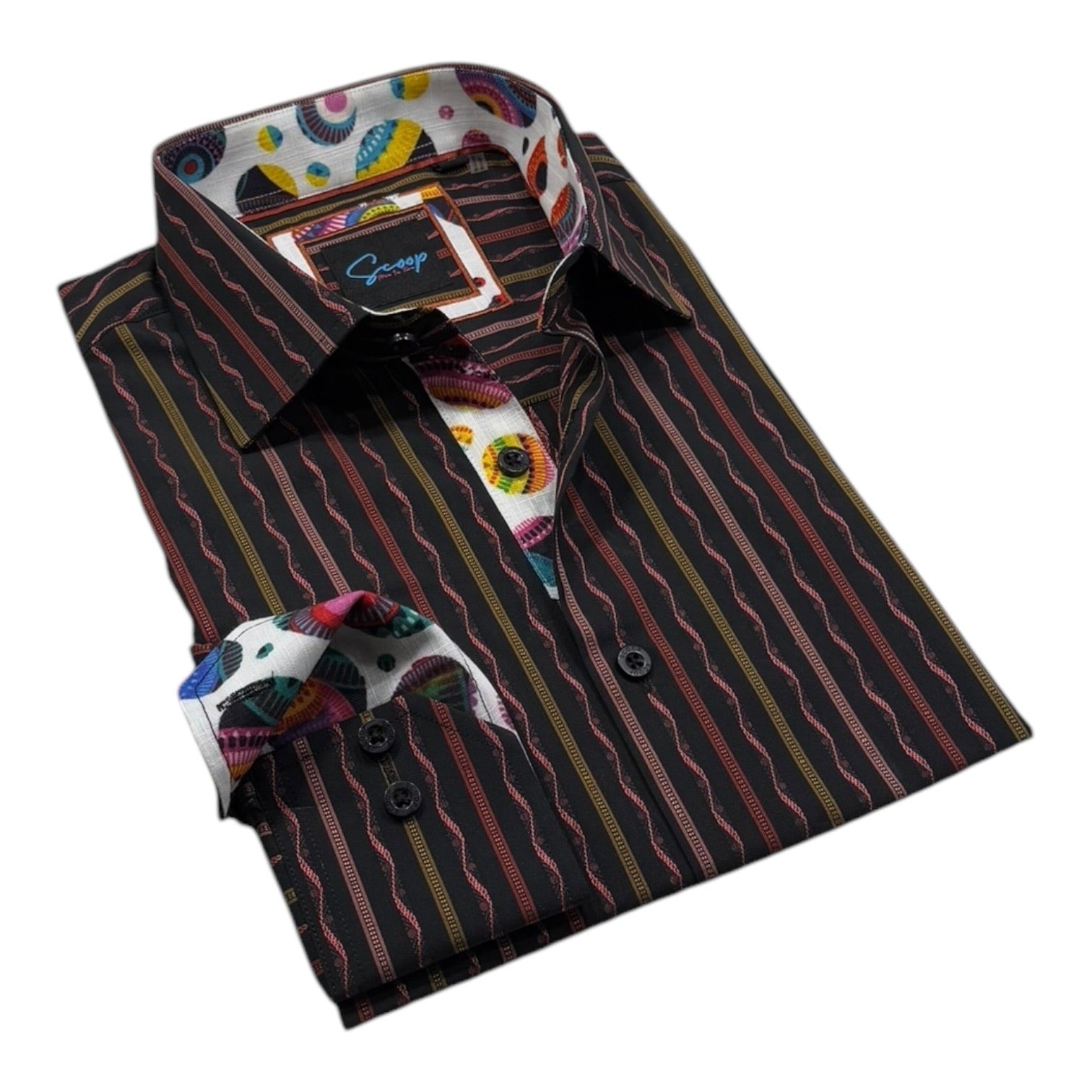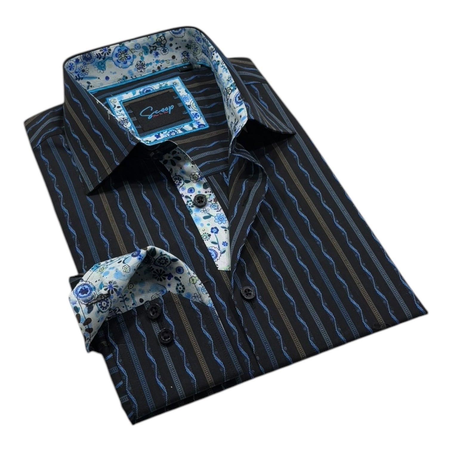 Meet the shirt that turns “subtle sophistication” into a bold statement — a design made for the modern trendsetter who loves to stand out without even trying. Featuring a sleek black canvas dressed in hypnotic wavy stripes, this shirt balances elegance with a playful edge. The real showstopper? Its unexpected twist of patterned contrast lining inside the collar, cuffs, and placket — a hidden pop of personality that makes rolling up your sleeves a fashion flex. With its sharp tailoring, unique detailing, and statement-worthy vibe, this isn’t just a shirt; it’s your next conversation starter.